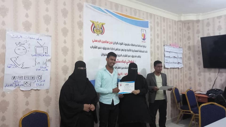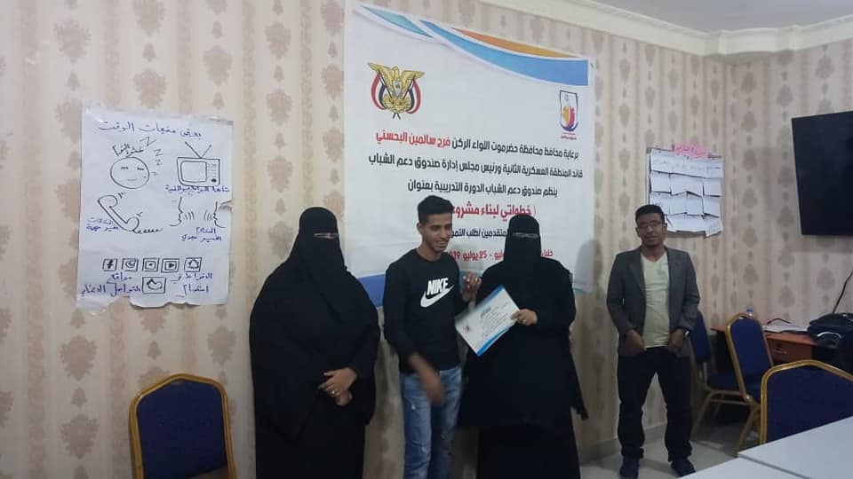 اختتمت مساء يوم الخميس 2019/7/25م بمدينة المكلا بقاعة صندوق دعم الشباب فعاليات البرنامج التدريبي خطواتي لبناء مشروعي الذي نظمه وموله صندوق دعم الشباب بمحافظة حضرموت برعاية كريمة من محافظ محافظة حضرموت قائد المنطقة العسكرية الثانية ورئيس مجلس إدارة الصندوق اللواء الركن فرج سالمين البحسني والذي استهدف قرابة 20 متدرب ومتدربة من العملاء المتقدمين لطلب التمويل من الصندوق وخريجين برنامج نهضة شباب الممول من منظمة اميدست.